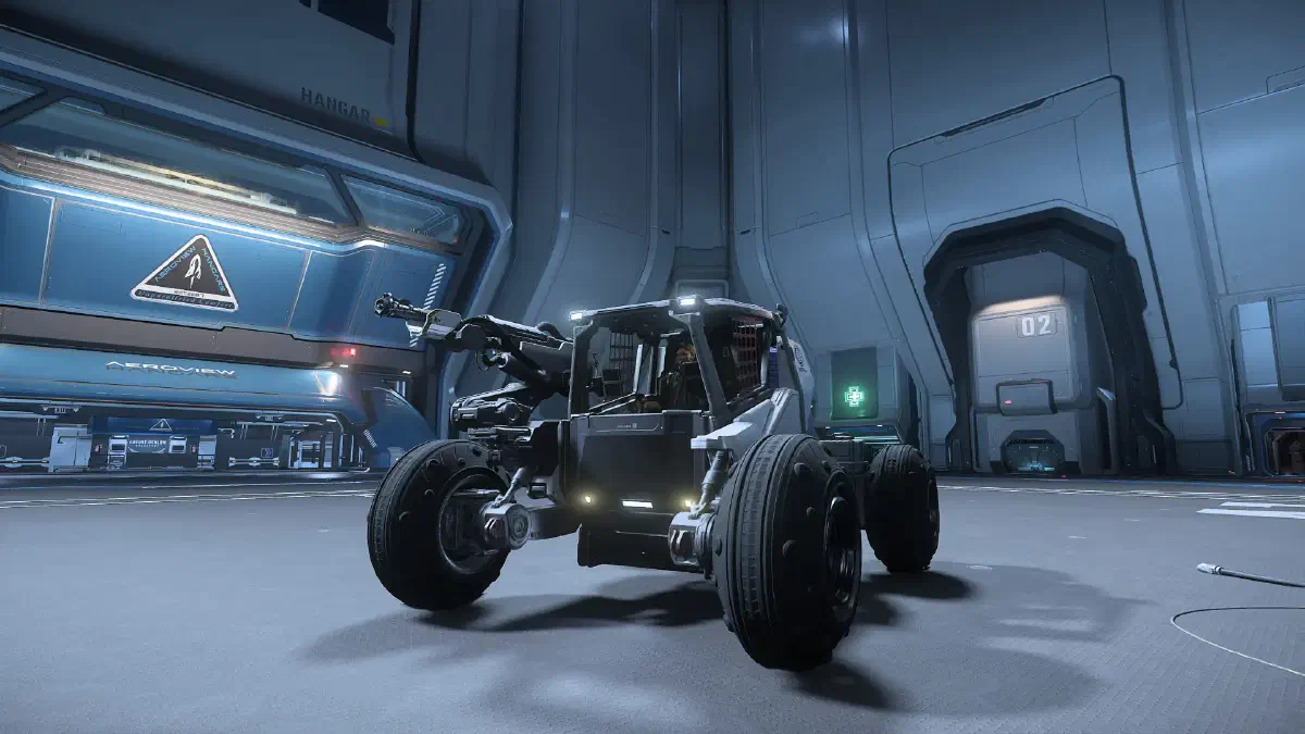 In deinem Hangar rufst du zuerst dein Miningfahrzeug rauf und fährst es zur Seite, so dass es beim erneuten Öffnen des Aufzugs nicht herunterfährt. Danach holst du dein Schiff.